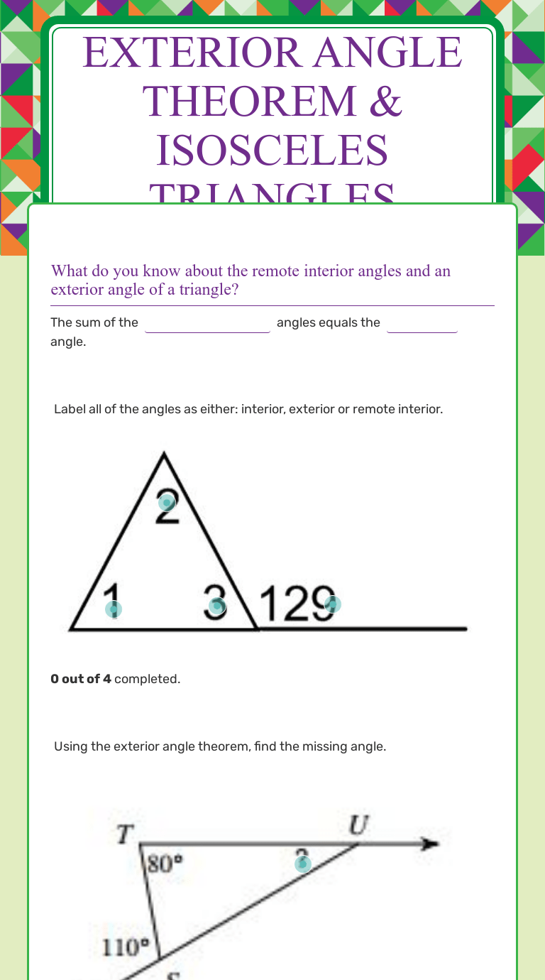 Please see the preview for details! Find out if you know how to calculate the exterior angle of a triangle by using this printable worksheet and interactive quiz. Check out these other items that practice this concept: This video shows how to solve problems that are on our free triangle exterior angle theorem worksheet that you can get by submitting your email above. An exterior angle of a triangle is an angle outside the triangle that forms a linear pair with one of the angles of the.